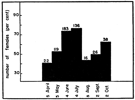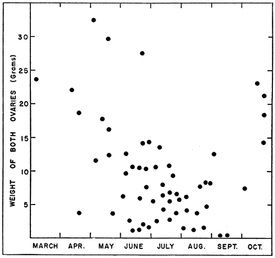 Ovaries ordinarily weighed most in October, March, and April, when most females contained enlarged follicles, and least in August and September when the supply of enlarged follicles was usually exhausted (Figs. 4 and 5).