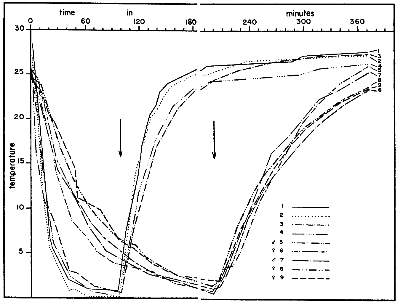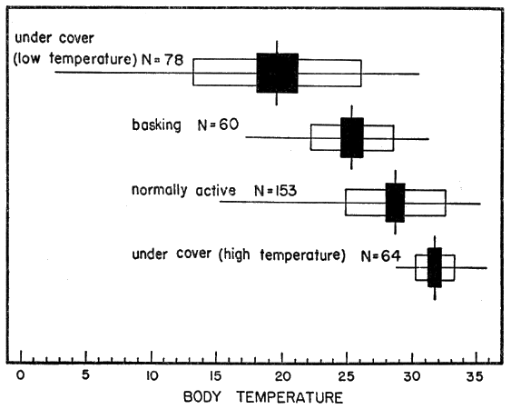 Body temperatures were taken by means of a quick-reading Schultheis thermometer inserted into the distal portion of the large intestine with the [Pg 539] bulb directed ventrally to avoid puncturing the bladder. Body temperature of turtles were altered little or not at all in the few seconds the turtles were held and no attempt was made (except for small juveniles) to insulate them from the warmth of my hands. Data recorded with body temperature were: air temperature (in shade, approximately one inch from turtle); ground temperature (or water temperature); behavior of turtle; weather conditions; nature of vegetation or other cover; and, time of day. Unless otherwise noted, temperatures are expressed in degrees Centigrade.