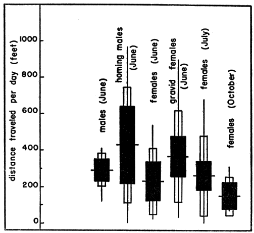 The relative numbers of box turtles found in different areas on the Damm Farm were, of course, governed to some extent by my activity in these areas and by the relative ease with which box turtles were seen in different types of vegetational cover. Turtles were more easily seen in the pasture (especially in sparsely vegetated or denuded areas) where much of my field work was done on horseback, than in the wooded areas, where excursions were usually made on foot. It was evident, however, after mapping known ranges and studying patterns of movement in marked turtles, that concentrations in the three above-mentioned areas of pasture were an indication of actual preference by turtles for the more favorable habitat in these areas rather than the result of incomplete sampling.