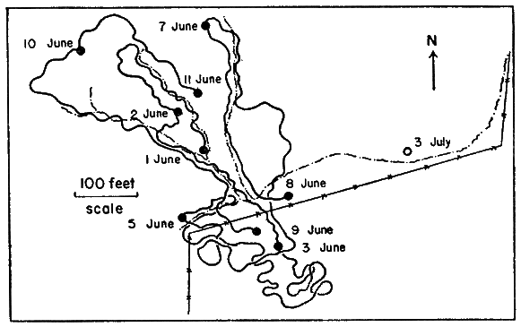 Prominent landmarks were rare or wanting in most places on the pasture. Locations of captures (or reference points in the movements of trailer-turtles) were determined by triangulation with a Brunton compass, using trees along fences as known points of reference. Rough maps were made in the field and used later, along with compass readings and measurements, to make a more precise record of movements and captures on a large map (scale, 100 feet to one inch) of the study area. Mapped points of capture in grassy areas were accurate within ten to twenty feet; points of capture in areas where landmarks were nearby were nearly exact. Areas were measured with a planimeter; distances traveled by individuals were measured with a cartometer.