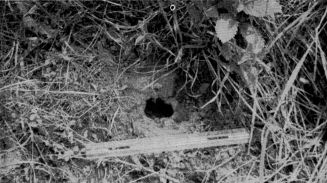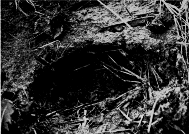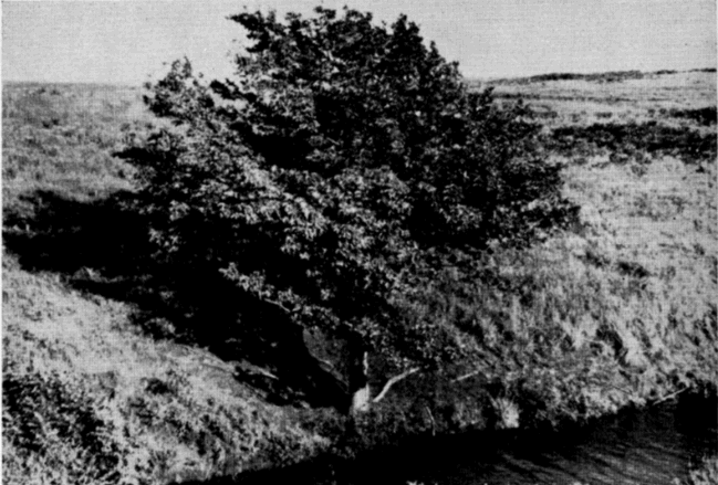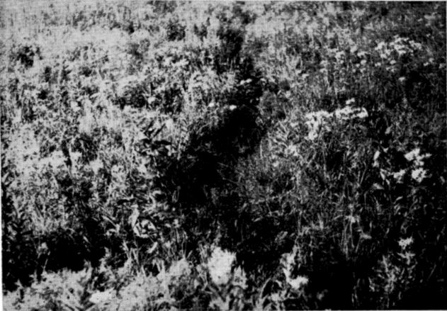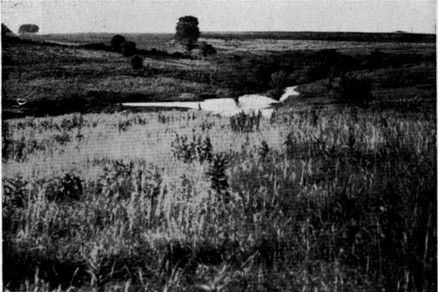 Tall grasses were dominant on the lower hillsides and small patches of Slough grass (Spartina pectinata) grew in moist areas. Ravines originated at small intermittent springs on the sides of the hill. The banks of ravines were high and steep and more or less bare of vegetation. High, dense stands of Slough grass grew at intermittent springs and along the courses of ravines; sedges (Carex, sp.) grew where small pools of water formed and created marshy conditions. Prairie grasses along the tops of ravine embankments formed a narrow overhanging canopy of vegetation that was accentuated in many places where the sod was under-cut by erosion or by the activities of burrowing animals (Pl. 18, Fig. 1). Box turtles frequently sought shelter beneath this vegetational canopy or burrowed beneath the sod.