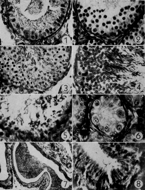 Mature sperm were found in epididymides at all times of the year but were most numerous in spring and autumn, the period between [Pg 548] spermatogenic cycles (Pl. 19, Fig. 7). Sperm expelled from the epididymides in autumn matings are seemingly replaced by others from the seminiferous tubules; the epididymides become much smaller when their supply of sperm is nearly exhausted after spring mating.