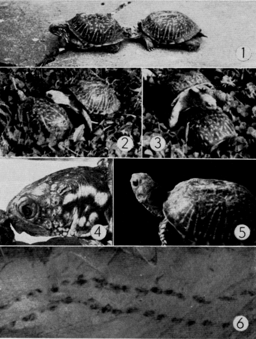 Norris and Zwiefel (1950:4) saw two captive individuals of T. o. luteola copulating on 12 August; copulation lasted two hours. Brumwell (1940:391-2) gave the following description of mating in T. o. ornata. A male pursued a female for nearly half an hour, first nudging the margins of her shell and later approaching her rapidly from the rear and hurling himself on her back in an attempt to mount, at the same time emitting a stream of liquid from each nostril. The liquid was presumably water; both sexes had imbibed [Pg 544] water in a pond just before courtship began. Brumwell suggested that pressure on the plastron of the male had forced the water out his nostrils. The pair remained in the coital position for 30 minutes after the male had achieved intromission. In another instance, Brumwell (loc. cit.) saw four males pursuing a single female, the males exhibiting the same behavior (nudging and lunging) outlined above. Males that attempted to mount other males were repelled by defensive snapping of the approached male. The female also snapped at some of the males that tried to mount her. One male was finally successful in mounting and was henceforth unmolested by the other males. Brumwell suggested that shell biting and tapping may be methods of sex-recognition.