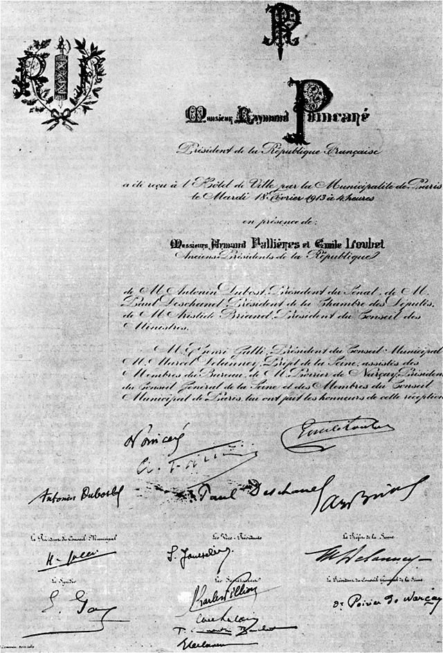 Nous contons d'autre part comment, après la présentation des personnages officiels dans la cour intérieure de l'Hôtel de Ville transformée en jardin d'hiver, les trois présidents, M. Poincaré, M. Fallières et M. Loubet, furent conviés à signer le procès-verbal de la cérémonie. Sur une table était posée la page qu'avait écrite, avec un soin patient, le dessinateur calligraphe de la Ville, M. Jules Commin, et qui doit figurer dans le Livre d'or. Nous reproduisons ici ce parchemin: il porte en marge l'écusson orné de la République, et, en tête, le monogramme du nouveau chef de l'État.