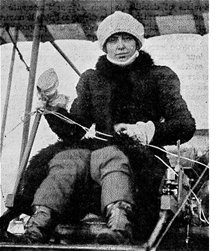 La courageuse jeune femme devait bientôt se laisser tenter et accaparer par l'aviation. Elle fit sa première envolée sur une «demoiselle» Santos-Dumont, monoplan extra léger, exigeant un véritable instinct d'acrobate et sur lequel bien peu d'aviateurs ont osé se risquer. On l'aperçoit ensuite sur un biplan, dans les Ardennes, au camp de Châlons, à Odessa, où elle fait une chute sérieuse.