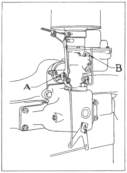 8. Set carburetor throttle stop screw "A" so that engine idles at a speed equal to a car speed of 5 m.p.h. in high gear.