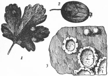 1, Leaf showing patches of cluster-cups on surface; 2, Fruit, showing same; 3, Cluster-cups much enlarged. |
