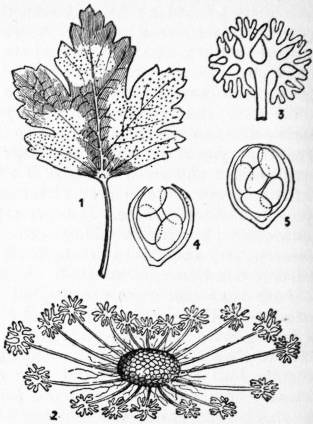 1, Leaf attacked by the fungus; 2, Fructification or perithecium; the end of one of its numerous appendages is shown more highly magnified in 3, 4, 5, spore sacs (asci) from the perithecium, containing spores. |