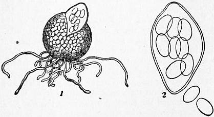 Fig. 3B.—1, Fructification (perithecium) bursting, ascus containing spores protruding; 2, Ascus with spores more highly magnified. |