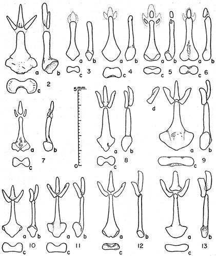 Figures 2-13. Bacula of microtines. Unless indicated otherwise views are (a) of the dorsum, (b) the right side, and (c) the proximal end with the dorsal surface upward. Exact localities are given in accounts of species concerned.