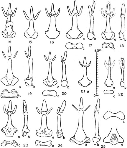 Figures 14-25. Bacula of Microtus. Unless indicated otherwise views are (a) of the dorsum, (b) the right side, and (c) the proximal end with dorsal surface upward.