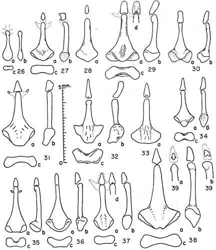 Figures 26-39. Bacula of microtines. Unless indicated otherwise views are (a) of the dorsum, (b) the right side, and (c) the proximal end with the dorsal surface upward.