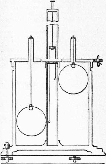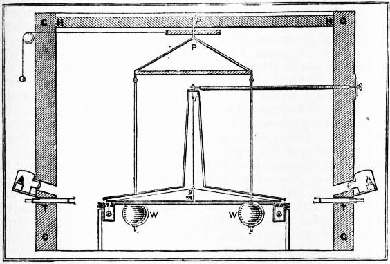 It is interesting to note that the possibility of gravitation experiments of this kind was first considered by Newton, and in both of the forms (1) and (2). In the System of the World (3rd ed., 1737, p. 40) he calculates that the deviation by a hemispherical mountain, of the earth’s density and with radius 3 m., on a plumb-line at its side will be less than 2 minutes. He also calculates (though with an error in his arithmetic) the acceleration towards each other of two spheres each a foot in diameter and of the earth’s density, and comes to the conclusion that in either case the effect is too small for measurement. In the Principia, bk. iii., prop. x., he makes a celebrated estimate that the earth’s mean density is five or six times that of water. Adopting this estimate, the deviation by an actual mountain or the attraction of two terrestrial spheres would be of the orders calculated, and regarded by Newton as immeasurably small.