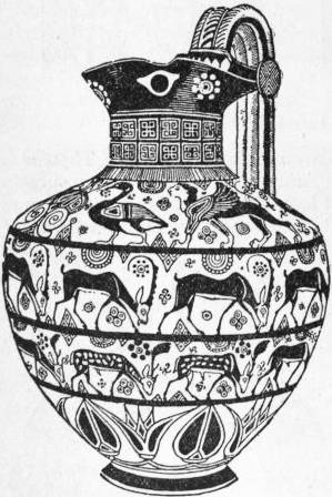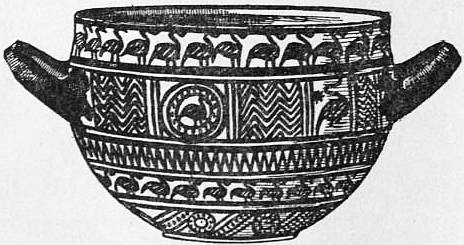 3. Ionic-Attic.—One of the earliest of Greek inscriptions—of the 7th century, at least—is the Attic inscription written in two lines from right to left upon a wine goblet (οἰνοχόη) given as a prize: hός νῦν ὀρχεστον πάντον | ἀταλότατα παίζει τοτο δεκᾶν μιν. The last words are uncertain. Till lately early inscriptions in Ionic were few, but recently an early inscription has been found at Ephesus and a later copy of a long early inscription at Miletus.