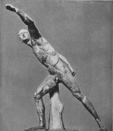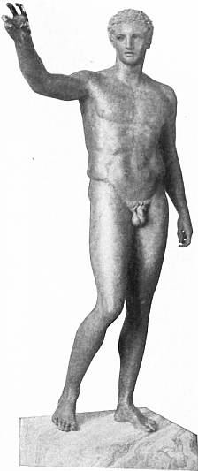 Besides the bronzes found in Rome we may set those recently found in the sea on the coast of Cythera, the contents of a ship sailing from Greece to Rome, and lost on the way. The date of these bronze statues has been disputed. In any case, even if executed in the Roman age, they go back to originals of the 5th and 4th centuries. The most noteworthy among them is a beautiful athlete (Plate V. fig. 73) standing with hand upraised, which reflects the style of the Attic school of the 4th century.