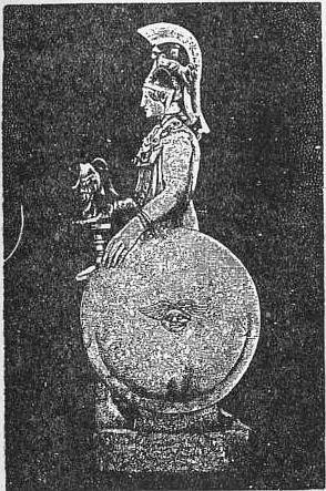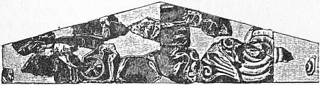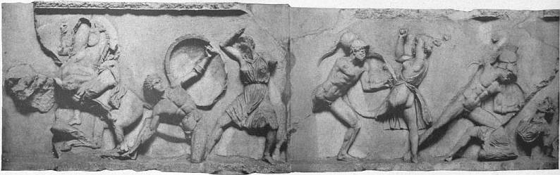 Our knowledge of the art of the later Hellenistic age has received a great accession since 1875 through the systematic labours directed by the German Archaeological Institute, which have resulted in recovering the remains Altar of Pergamum. of Pergamum, the fortress-city which was the capital of the dynasty of the Philetaeri. Among the ancient buildings of Pergamum none was more ambitious in scale and striking in execution than the great altar used for sacrifices to Zeus, a monument supposed to be referred to in the phrase of the Apocalypse “where Satan’s throne is.” This altar, like many great sacrificial altars of later Greece, was a vast erection to which one mounted by many steps, and its outside was adorned with a frieze which represented on a gigantic scale, in the style of the 2nd century B.C., the battle between the gods and the giants. This enormous frieze (see Pergamum) is now one of the treasures of the Royal Museums of Berlin, and it cannot fail to impress visitors by the size of the figures, the energy of the action, and the strong vein of sentiment which pervades the whole, giving it a certain air of modernity, though the subject is strange to the Christian world. In early Greek art the giants where they oppose the gods are represented as men armed in full panoply, “in shining armour, holding long spears in their hands,” to use the phrase in which Hesiod describes them. But in the Pergamene frieze the giants are strange compounds, having the heads and bodies of wild and fierce barbarians, sometimes also human legs, but sometimes in the place of legs two long serpents, the heads of which take with the giants themselves a share in the battle. Sometimes also they are winged. The gods appear in the forms which had been gradually made for them in the course of Greek history, but they are usually accompanied by the animals sacred to them in cultus, between which and the serpent-feet of the giants a weird combat goes on. We can conjecture the source whence the Pergamene artist derived the shaggy hair, the fierce expression, the huge muscles of his giants (fig. 49); probably these features came originally from the Galatians, who at the time had settled in Asia Minor, and were spreading the terror of their name and the report of their savage devastations through all Asia Minor. The victory over the giants clearly stands for the victory of Greek civilization over Gallic barbarism; and this meaning is made more emphatic because the gods are obviously inferior in physical force to their opponents, indeed, a large proportion of the divine combatants are goddesses. Yet everywhere the giants are overthrown, writhing in pain on the ground, or transfixed by the weapons of their opponents; everywhere the gods are victorious, yet in the victory retain much of their divine calm. The piecing together of the frieze at Berlin has been a labour of many years; it is now complete, and there is a special museum devoted to it. Some of the groups have become familiar to students from photographs, especially the group which represents Zeus slaying his enemies with thunderbolts, and the group wherein Athena seizes by the hair an overthrown opponent, who is winged, while Victory runs to crown her, and beneath is seen Gaia, the earth-goddess who is the mother of the giants, rising out of the ground, and mourning over her vanquished and tortured children. Another and smaller frieze which also decorated the altar-place gives us scenes from the history of Telephus, who opposed the landing of the army of Agamemnon in Asia Minor and was overthrown by Achilles. This frieze, which is quite fragmentary, is put together by Dr Schneider in the Jahrbuch of the German Archaeological Institute for 1900.