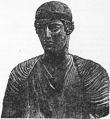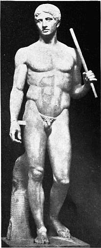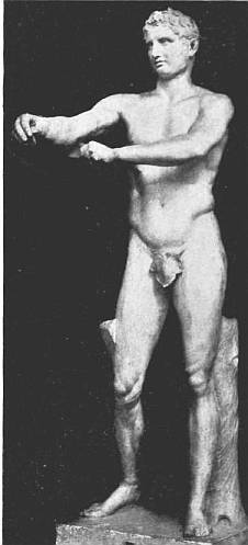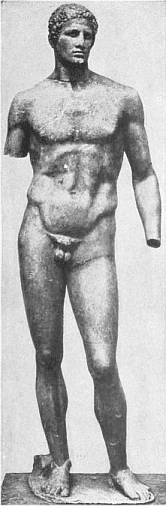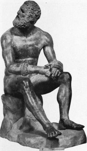 The extensive excavations and alterations which have taken place at Rome in recent years have been very fruitful; the results may be found partly in the palace of the Conservatori on the Capitol, partly in the new museum Rome. of the Terme. Among recently found statues none excel in interest some bronzes of large size dating from the Hellenistic age. In the figure of a seated boxer (Plate V. fig. 72), in scale somewhat exceeding life, attitude and gesture are expressive. Evidently the boxer has fought already, and is awaiting a further conflict. His face is cut and swollen; on his hands are the terrible caestus, here made of leather, and not loaded with iron, like the caestus described by Virgil. The figure is of astounding force; but though the face is brutal and the expression savage, in the sweep of the limbs there is nobility, even ideal beauty. To the last the Greek artist could not set aside his admiration for physical perfection. Another bronze figure of more than life-size is that of a king of the Hellenistic age standing leaning on a spear. He is absolutely nude, like the athletes of Polyclitus. Another large bronze presents us with a Hellenistic type of Dionysus.
