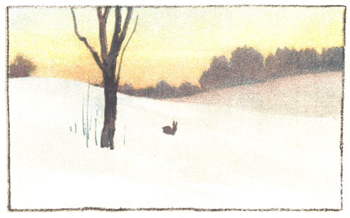 Look at this winter picture. The sky is bright and the distant trees look violet. Did you ever notice that the snow at sunset does not seem to be white as you look across it to the horizon? If you hold a sheet of white paper in your hand and glance from that across the snow-covered fields at sunset, you will see that the whiteness of the snow has changed to violet-gray. Sometimes, too, the snow seems to be tinted by the rosy light of the sunset. As you study out-of-door objects, you will find that their colors appear different at different times of the day, or as they are near you or far away.