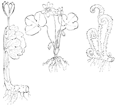 In our houses, too, everything has color—not the bright hues that we find in flowers and landscapes, but softer, grayed color. We would not like carpets and wall-paper of the bright color we find in poppies, for instance. The colors we use in our furnishings should not be glaring and intense, but quiet and restful. To find these color relations, and to train the eye to know and enjoy fine color harmonies, we study what artists have done, in paintings and other works of art. In nature, too, we find color suggestions in endless variety. In autumn the world is flooded with rich color. Even the common weed that is shown you on this page shows a combination of colors that would be safe to use in any work of our own. See how the colors in the plant have been arranged in a little scale. Such an arrangement is called a color scheme.