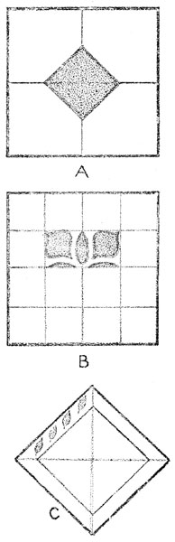 In Sketch B diameters are drawn and in the center is a small square on its diagonals. Little pathways lead from the sides of the square to the center, resulting in a four-sided decoration. In Sketch C diagonals are drawn and pathways sent along them to the center. Sketches D, E, and F are like A, B, and C, except that curved lines have been used instead of straight lines.