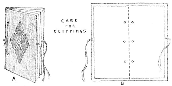 This portfolio may be made by pasting tinted paper or book linen over cardboards. The boards should be covered first with the material chosen for the outside. Then the corners and back should be added, and a lining of paper pasted across both boards on the inside. The space for a name on the outside should be carefully planned. Within this space should be drawn very carefully, the letters of any name you may wish to place on the portfolio.