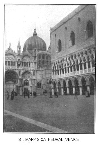 Arrival at Venice: The ubiquitous Gondolo: The Grand Canal: The curious water ways: Our Hotel: A snap shot of a Gondolo and its freight: St. Mark’s Cathedral: Its curious history: Its wonderful Tower, and its interior possessions. |
