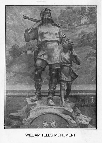 He was famous as a crossbowman, could shoot an arrow with great precision. The Canton in which he was born and lived was partly, if not entirely, under Austrian rule of that time, and so imperious was Gesler, the Governor, that he demanded of his people that when his hat was hung up in the market place of the town, every one passing should doff his hat and bow to it. William Tell refused to be so humiliated, and, as the result of his refusal, he was arrested, and it was demanded of him to shoot through an apple placed on the head of his only child, a boy of ten, at a distance of fifty yards. This, Tell accomplished without injury to his son; he, however, declared in his own mind the next arrow should go into the heart of Gesler, the tyrant. Tell, however, was not liberated, but p. 145was being taken a prisoner to the castle across this lake. While crossing, a very sudden squall arose, threatening to upset the boat which had Gesler and his prisoner Tell on board. So severe was the storm that Tell was liberated from his chains and asked to take an oar, it was known that he was a clever oarsman. Tell saw his opportunity, he ran the boat on the rocks, then leaping out he pushed the boat off into the lake again. Gesler, however, managed to land, but he fell to the arrow of Tell who had watched and waited for him for some time. To be relieved of so imperious a Governor was to constitute Tell an hero, hence the keeping his memory green by building a chapel; he is also commemorated in song as well as in story. Tell sings: