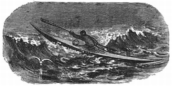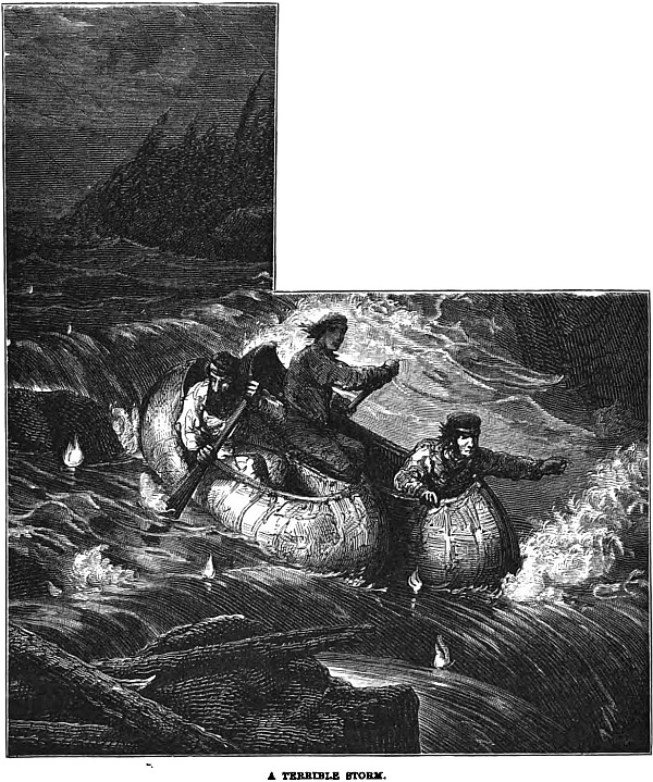 “Well was it for us we had lashed our frail canoes together, for there was one portion of the great river which it was dangerous to descend, even in fine weather, so rapid was the current. When we reached this place the storm was at its very worst, and we found ourselves suddenly whirling along in the midst of a raging cataract, a boiling surging cataract. The thunder seemed rending the forest, and the very rocks around us; the rain was terrible, and I had never seen such lightning before; forked and sheet I had been used to, but here great balls of fire fell from heaven, splitting, and hissing as they reached the waves. It was indeed a fearful storm. When we reached camp at long last, we expected to find that our horses had broken loose in the extremity of their terror, but we were greatly mistaken; here they were safe enough, and although there was evidence in the state of the ground that they had been at first alarmed, they were quiet now; ay, even cowed in their joy to see us, they fawned upon us almost as a dog would have done.