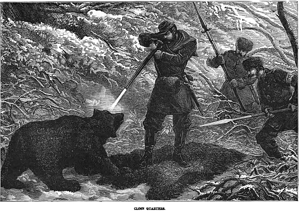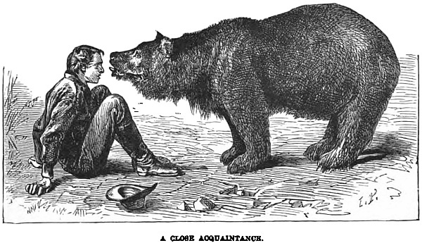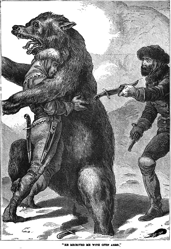 “Jack and I were both in the melée next moment. The merciful moon shone out, and we could see our guide on his feet covered with blood, but defending himself bravely with a brawny fist and a broken lantern. Not far off was our burly camp-dog engaged with three of the hungry-eyed monsters. Jack and I soon turned the odds to deadly game, but Walter was badly wounded, and it took weeks to get him well. It seems he had taken his lantern and gone out to see if the horses were secure, when he was at once attacked by the wolves. Winter brought us visitors from the far north, the grizzly bear and his cousin the cinnamon bear. They used to hide in the darkest and deepest nooks of the forest by day, or in rocky dens by the mountain sides, and come prowling out by night, oftentimes making the woods shake with their terrible roaring.
