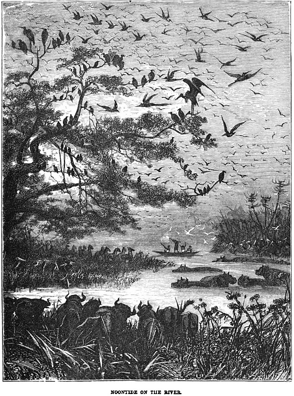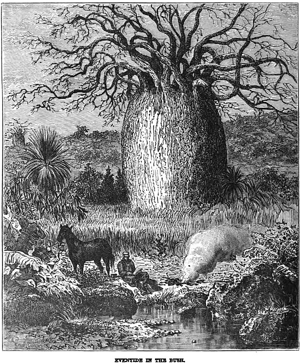 “For many months after we had once crossed the prairie-lands, and the terrible alkali flats, we followed the course of a broad-bosomed river, so that our compasses were of but little use to us, for one day this stream would take us right away up north, the next day west or south-west. It certainly was in no great hurry to reach its destination; but neither were we, so it just suited us. We were contented, nay, more, we were perfectly happy; we slept at night as hunters sleep, and we awoke at early dawn fresh as the forest birds that flitted joyously around us, and quite prepared for another day’s work. It was work sometimes, too, and no mistake; work that many a British ploughman would have considered toil, for we had our waggons to fetch along, and that sometimes entailed long journeys round, to avoid a forest too dense, or river banks too rocky.