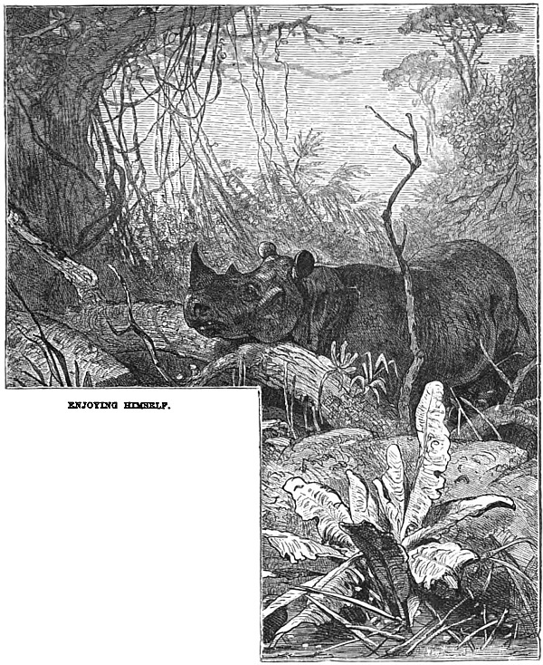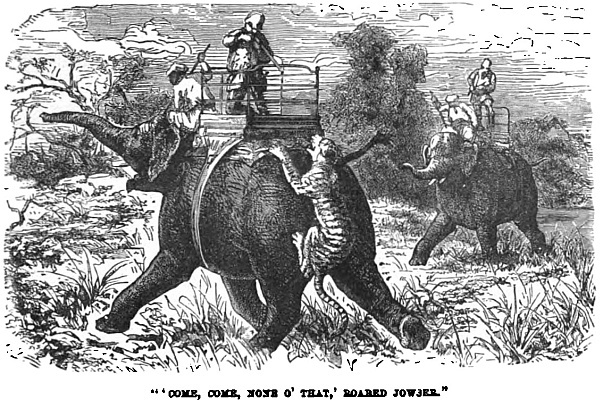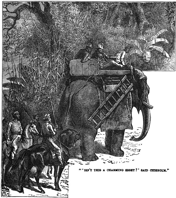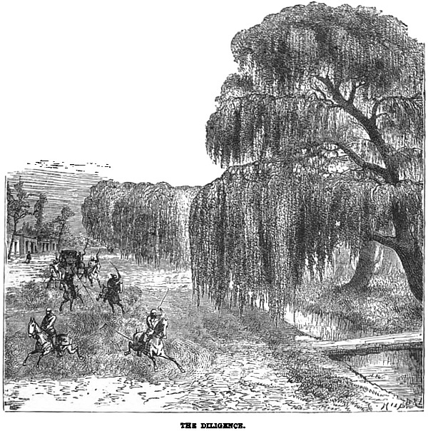 Now the journey is changed to one by river. Not much of a boat, to be sure; but then it is comparatively cool, and the scenery is sylvan and delightful. On once more next day, this time by diligence. This conveyance had none of the comfort of the Hyde Park canoe-landau. It was just what Lyell called it in pardonable slang, “a rubbly old concern—a sort of breed betwixt an orange-box, a leathern portmanteau, and a venerable clothes-basket. They paid a hawser out from its bows, and bent the nags on to that.” Frank thought of his elephant ride.