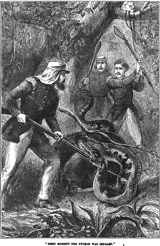 Frank trod on the tail of an iguana next day. The dragon, seven feet long, and fearful to behold, turned and snapped. Frank, armed with a stick, would not fly, but fought. The Scotchmen were delighted. They tossed their bonnets in the air, and shouted “Saint George for merrie England!” Never mind, they might laugh as they pleased; but Frank killed the dragon.