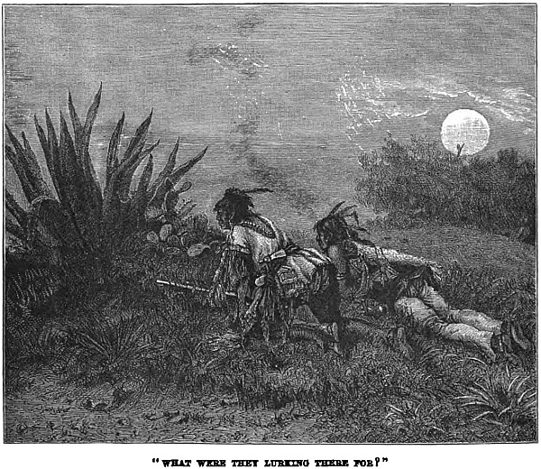 Chisholm wanted one day to go ostrich-stalking, or rhea-hunting you might better term it. These curious birds are as fleet as the wind, you cannot ride them down in the open; but you can approach them near enough with mules, to get a shot when fires are lit here and there on the plain, and the creatures get confused. It had been a long day’s sport; and the moon had arisen, and was flooding all the beautiful country with its soft and mellow light, ere the party had got within two leagues of the estancia. But they knew the welcome that there awaited them, and so on they rode, slowly but cheerfully, singing as they went. There would have been less music at their hearts, had they seen the expression of mingled hate and cunning on the faces of those fiends behind the cactus bush. What were they lurking there for? Why did they not come boldly forth?