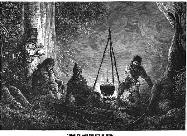 And here we have the five of them, mostly intent on the preparation of the evening meal. Lyell is cook to-night; and he evidently cooks from no badly-stored larder. Yonder hangs a lordly deer; wild-fowl they have in prolusion; and in a short time they will, doubtless, enjoy their al fresco dinner as only sportsmen can.