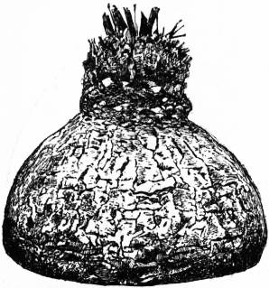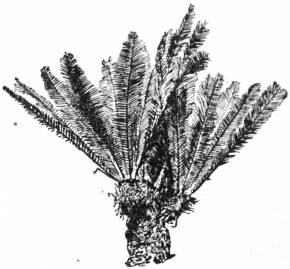 The cycads constitute a homogeneous group of a few living members confined to tropical and sub-tropical regions. As a fairly typical and well-known example of the Cycadaceae, a species of the genus Cycas (e.g. C. circinalis, C. revoluta, &c.) is briefly described. The stout columnar stem may reach a height of 20 metres, and a diameter of half a metre; it remains either unbranched or divides near the summit into several short and thick branches, each branch terminating in a crown of long pinnate leaves. The surface of the stem is covered with rhomboidal areas, which represent the persistent bases of foliage- and scale-leaves. In some species of Cycas there is a well-defined alternation of transverse zones on the stem, consisting of larger areas representing foliage-leaf bases, and similar but smaller areas formed by the bases of scale-leaves (F and S, fig. 1). The scale-leaves clothing the terminal bud are linear-lanceolate in form, and of a brown or yellow colour; they are pushed aside as the stem-axis elongates and becomes shrivelled, finally falling off, leaving projecting bases which are eventually cut off at a still lower level. Similarly, the dead fronds fall off, leaving a ragged petiole, which is afterwards separated from the stem by an absciss-layer a short distance above the base. In some species of Cycas the leaf-bases do not persist as a permanent covering to the stem, but the surface 755 is covered with a wrinkled bark, as in Cycas siamensis, which has a stem of unusual form (fig. 2). Small tuberous shoots, comparable on a large scale with the bulbils of Lycopodium Selago, are occasionally produced in the axils of some of the persistent leaf-bases; these are characteristic of sickly plants, and serve as a means of vegetative reproduction. In the genus Cycas the female flower is peculiar among cycads in consisting of a terminal crown of separate leaf-like carpels several inches in length; the apical portion of each carpellary leaf may be broadly triangular in form, and deeply dissected on the margins into narrow woolly appendages like rudimentary pinnae. From the lower part of a carpel are produced several laterally placed ovules, which become bright red or orange on ripening; the bright fleshy seeds, which in some species are as large as a goose’s egg, and the tawny spreading carpels produce a pleasing combination of colour in the midst of the long dark-green fronds, which curve gracefully upwards and outwards from the summit of the columnar stem. In Cycas the stem apex, after producing a cluster of carpellary leaves, continues to elongate and produces more bud-scales, which are afterwards pushed aside as a fresh crown of fronds is developed. The young leaves of Cycas consist of a straight rachis bearing numerous linear pinnae, traversed by a single midrib; the pinnae are circinately coiled like the leaf of a fern (fig. 3). The male flower of Cycas conforms to the type of structure characteristic of the cycads, and consists of a long cone of numerous sporophylls bearing many oval pollen-sacs on their lower faces. The type described serves as a convenient representative of its class. There are eight other living genera, which may be classified as follows:—
