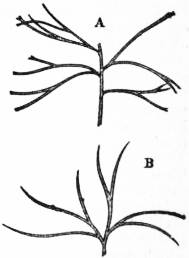 With a few exceptions conifers are evergreen, and retain the leaves for several years (10 years in Araucaria imbricata, 8 to 10 in Picea excelsa, 5 in Taxus baccata; in Pinus the needles usually fall in October of their third year). The larch (Larix) Leaves. sheds its leaves in the autumn, in the Chinese larch (Pseudolarix Kaempferi) the leaves turn a bright yellow colour before falling. In the swamp cypress (Taxodium distichum) the tree assumes a rich brown colour in the autumn, and sheds its leaves together with the branchlets which bear them; deciduous branches occur also in some other species, e.g. Sequoia sempervirens (redwood), Thuja occidentalis, &c. The leaves of conifers are characterized by their small size, e.g. the needle-form represented by Pinus, Cedrus, Larix, &c., the linear flat or angular leaves, appressed to the branches, of Thuja, Cupressus, Libocedrus, &c. The flat and comparatively broad leaves of Araucaria imbricata, A. Bidwillii, and some species of the southern genus Podocarpus are traversed by several parallel veins, as are also the still larger leaves of Agathis, which may reach a length of several inches. In addition to the foliage-leaves several genera also possess scale-leaves of various kinds, represented by bud-scales in Pinus, Picea, &c., which frequently persist for a time at the base of a young shoot which has pushed its way through the yielding cap of protecting scales, while in some conifers the bud-scales adhere together, and after being torn near the base are carried up by the growing axis as a thin brown cap. The cypresses, araucarias and some other genera have no true bud-scales; in some species, e.g. Araucaria Bidwillii, the occurrence of small foliage-leaves, which have functioned as bud-scales, at intervals on the shoots affords a measure of seasonal growth. The occurrence of long and short shoots is a characteristic feature of many conifers. In Pinus the needles occur in pairs, or in clusters of 3 or 5 at the apex of a small and inconspicuous short shoot of limited growth (spur), which is enclosed at its base by a few scale-leaves, and borne on a branch of unlimited growth in the axil of a scale-leaf. In the Californian Pinus monophylla each spur bears usually one needle, but two are not uncommon; it would seem that rudiments of two needles are always produced, but, as a rule, only one develops into a needle. In Sciadopitys similar spurs occur, each bearing a single needle, which in its grooved surface and in the possession of a double vascular bundle bears traces of an origin from two needle-leaves. A peculiarity of these leaves is the inverse orientation of the vascular tissue; each of the two veins has its phloem next the upper and the xylem towards the lower surface of the leaf; this unusual position of the xylem and phloem may be explained by regarding the needle of Sciadopitys as being composed of a pair of leaves borne on a short axillary shoot and fused by their margins (fig. 15, A). Long and short shoots occur also in Cedrus and Larix, but in these genera the spurs are longer and stouter, and are not shed with the leaves; this kind of short shoot, by accelerated apical growth, often passes into the condition of a long shoot on which the leaves are scattered and separated by comparatively long internodes, instead of being crowded into tufts such as are borne on the ends of the spurs. In the genus Phyllocladus (New Zealand, &c.) there are no green foliage-leaves, but in their place flattened branches (phylloclades) borne in the axils of small scale-leaves. The cotyledons are often two in number, but sometimes (e.g. Pinus) as many as fifteen; these leaves are usually succeeded by foliage-leaves in the form of delicate spreading needles, and these primordial leaves are followed, sooner or later, by the adult type of leaf, except in Retinosporas, which retain the juvenile foliage. In addition to the first foliage-leaves and the adult type of leaf, there are often produced leaves which are intermediate both in shape and structure between the seedling and adult foliage. Dimorphism or heterophylly is fairly common. One of the best known examples is the Chinese juniper (Juniperus chinensis), in which branches with spinous leaves, longer and more spreading than the ordinary adult leaf, are often found associated with the normal type of branch. In some cases, e.g. Sequoia sempervirens, the fertile branches bear leaves which are less spreading than those on the vegetative shoots. Certain species of the southern hemisphere genus Dacrydium afford particularly striking instances of heterophylly, e.g. D. Kirkii of New Zealand, in which some branches bear small and appressed leaves, while in others the leaves are much longer and more spreading. A well-known fossil conifer from Triassic strata—Voltzia heterophylla—also illustrates a marked dissimilarity in the leaves of the same shoot. The variation in leaf-form and the tendency of leaves to arrange themselves in various ways on different branches of the same plant are features which it is important to bear in mind in the identification of fossil conifers. In this connexion we may note the striking resemblance between some of the New Zealand Alpine Veronicas, e.g. Veronica Hectori, V. cupressoides, &c. (also Polycladus cupressinus, a Composite), and some of the cypresses and other conifers with small appressed leaves. The long linear leaves of some species of Podocarpus, in which the lamina is traversed by a single vein, recall the pinnae of Cycas; the branches of some Dacrydiums and other forms closely resemble those of lycopods; these superficial resemblances, both between different genera of conifers and between conifers and other plants, coupled with the usual occurrence of fossil coniferous twigs without cones attached to them, render the determination of extinct types a very unsatisfactory and frequently an impossible task.