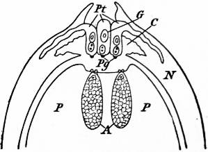 P, Prothallus. A, Archegonia. N, Nucellus. C, Pollen-chamber. |