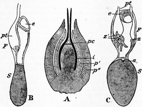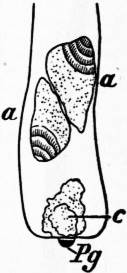 Fig. 8.—Zamia. Proximal end of Pollen-tube, a, a, Spermatozoids from G of fig. 7; Pg, pollen-grain; c, proximal cell (first cell). (After Webber.) |