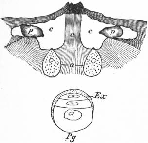 p, Pollen-tube (proximal end). c, Pollen-chamber. e, Upward prolongation of megaspore. a, Archegonia. Pg, Pollen-grain. Ex, Exine. |