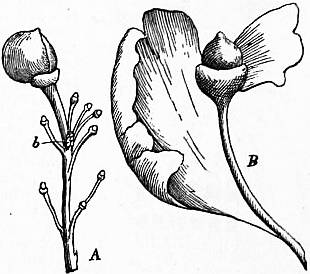 Fig. 14.—Ginkgo. Abnormal female Flowers. A, Peduncle; b, scaly bud; B, leaf bearing marginal ovule. (After Fujii.) |