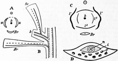 Fig. 15.—Diagrammatic treatment of: A, Double needle of Sciadopitys (a, a, leaves; b, shoot; Br, bract). B, seminiferous scale as leaf of axillary shoot (b, shoot; Sc, seminiferous scale; Br, bract). C, seminiferous scale as fused pair of leaves (l1, l2, l3, first, second and third leaves; b, shoot; Br, bract). D, cone-scale of Araucaria (n, nucellus; i, integument; x, xylem). |