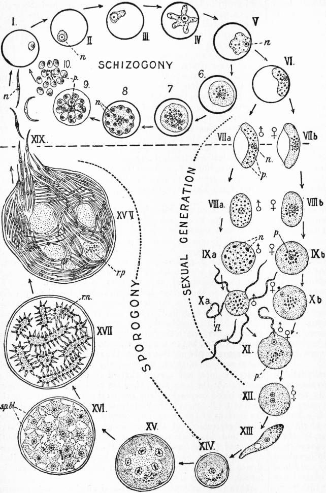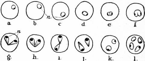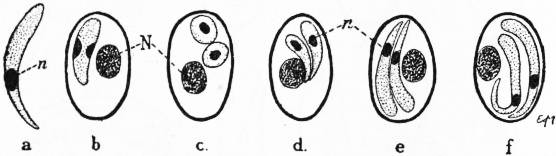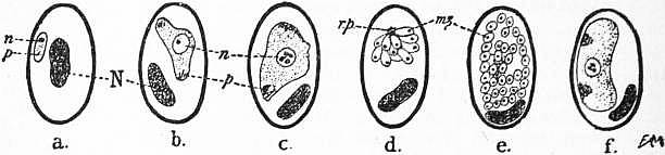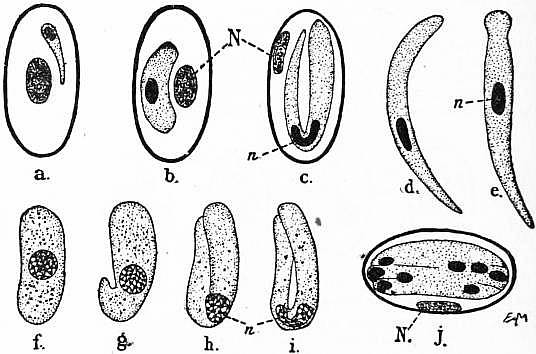 The pollen-grains when mature consist of three cells, two small and one large cell; the latter grows into the pollen-tube, as in the Coniferales, and from one of the small cells two large ciliated spermatozoids are eventually produced. A Microspores and megaspores. remarkable exception to this rule has recently been recorded by Caldwell, who found that in Microcycas Calocoma the body-cells may be eight or even ten in number and the sperm-cells twice as numerous. One of the most important discoveries made during the latter part of the 19th century was that by Ikeno, a Japanese botanist, who first demonstrated the existence of motile male cells in the genus Cycas. Similar spermatozoids were observed in some species of Zamia by H. J. Webber, and more recent work enables us to assume that all cycads produce ciliated male gametes. Before following the growth of the pollen-grain after pollination, we will briefly describe the structure of a cycadean ovule. An ovule consists of a conical nucellus surrounded by a single integument. At an early stage of development a large cell makes its appearance in the central region of the nucellus; this increases in size and eventually forms three cells; the lowest of these grows vigorously and constitutes the megaspore (embryo-sac), which ultimately absorbs the greater part of the nucellus. The megaspore-nucleus divides repeatedly, and cells are produced from the peripheral region inwards, which eventually fill the spore-cavity with a homogeneous tissue (prothallus); some of the superficial cells at the micropylar end of the megaspore increase in size and divide by a tangential wall into two, an upper cell which gives rise to the short two-celled neck of the archegonium, and a lower cell which develops into a large egg-cell. Each megaspore may contain 2 to 6 archegonia. During the growth of the ovum nourishment is supplied from the contents of the cells immediately surrounding the egg-cell, as in the development of the ovum of Pinus and other conifers. Meanwhile the tissue in the apical region of the nucellus has been undergoing disorganization, which results in the formation of a pollen-chamber (fig. 7, C) immediately above the megaspore. Pollination in cycads has always been described as anemophilous, but according to recent observations by Pearson on South African species it seems probable that, at least in some cases, the pollen is conveyed to the ovules by animal agency. The pollen-grains find their way between the carpophylls, which at the time of pollination are slightly apart owing to the elongation of the internodes of the flower-axis, and pass into the pollen-chamber; the large cell of the pollen-grain grows out into a tube (Pt), which penetrates the nucellar tissue and often branches repeatedly; the pollen-grain itself, with the prothallus-cells, projects freely into the pollen-chamber (fig. 7). The nucleus of the outermost (second) small cell (fig. 7, G) divides, and one of the daughter-nuclei passes out of the cell, and may enter the lowest (first) small cell. The outermost cell, by the division of the remaining nucleus, produces two large spermatozoids (fig. 8, a, a). In Microcycas 16 sperm-cells are produced. In the course of division two bodies appear in the cytoplasm, and behave as centrosomes during the karyokinesis; they gradually become threadlike and coil round each daughter nucleus. This thread gives rise to a spiral ciliated band lying in a depression on the body of each spermatozoid; the large spermatozoids eventually escape from the pollen-tube, and are able to perform ciliary movements in the watery liquid which occurs between the thin papery remnant of nucellar tissue and the archegonial necks. Before fertilization a neck-canal cell is formed by the division of the ovum-nucleus. After the body of a spermatozoid has coalesced with the egg-nucleus the latter divides repeatedly and forms a mass of tissue which grows more vigorously in the lower part of the fertilized ovum, and extends upwards towards the apex of the ovum as a peripheral layer of parenchyma surrounding a central space. By further growth this tissue gives rise to a proembryo, which consists, at the micropylar end, of a sac; the tissue at the chalazal end grows into a long and tangled suspensor, terminating in a mass of cells, which is eventually differentiated into a radicle, plumule and two cotyledons. In the ripe seed the integument assumes the form of a fleshy envelope, succeeded internally by a hard woody shell, internal to which is a thin papery membrane—the apical portion of the nucellus—which is easily dissected out as a conical cap covering the apex of the endosperm. A thorough examination of cycadean seeds has recently been made by Miss Stopes, more particularly with a view to a comparison of their vascular supply with that in Palaeozoic gymnospermous seeds (Flora, 1904). The first leaves borne on the seedling axis are often scale-like, and these are followed by two or more larger laminae, which foreshadow the pinnae of the adult frond.