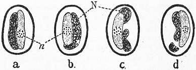 A pollen-grain when first formed from its mother-cell consists of a single cell; in this condition it may be carried to the nucellus of the ovule (e.g. Taxus, Cupressus, &c.), or more usually (Pinus, Larix, &c.) it reaches maturity before the dehiscence Micro-spores and megaspores. of the microsporangium. The nucleus of the microspore divides and gives rise to a small cell within the large cell, a second small cell is then produced; this is the structure of the ripe pollen-grain in some conifers (Taxus, &c.). The large cell grows out as a pollen-tube; the second of the two small cells (body-cell) wanders into the tube, followed by the nucleus of the first small cell (stalk-cell). In Taxus the body-cell eventually divides into two, in which the products of division are of unequal size, the larger constituting the male generative cell, which fuses with the nucleus of the egg-cell. In Juniperus the products of division of the 761 body-cell are equal, and both function as male generative cells. In the Abietineae cell-formation in the pollen-grain is carried farther. Three small cells occur inside the cavity of the microspore; two of them collapse and the third divides into two, forming a stalk-cell and a larger body-cell. The latter ultimately divides in the apex of the pollen-tube into two non-motile generative cells. Evidence has lately been adduced of the existence of numerous nuclei in the pollen-tubes of the Araucarieae, and it seems probable that in this as in several other respects this family is distinguished from other members of the Coniferales. The precise method of fertilization in the Scots Pine was followed by V. H. Blackman, who also succeeded in showing that the nuclei of the sporophyte generation contain twice as many chromosomes as the nuclei of the gametophyte. Other observers have in recent years demonstrated a similar relation in other genera between the number of chromosomes in the nuclei of the two generations. The ovule is usually surrounded by one integument, which projects beyond the tip of the nucellus as a wide-open lobed funnel, which at the time of pollination folds inwards, and so assists in bringing the pollen-grains on to the nucellus. In some conifers (e.g. Taxus, Cephalotaxus, Dacrydium, &c.) the ordinary integument is partially enclosed by an arillus or second integument. It is held by some botanists (Celakovský) that the seminiferous scale of the Abietineae is homologous with the arillus or second integument of the Taxaceae, but this view is too strained to gain general acceptance. In Araucaria and Saxegothaea the nucellus itself projects beyond the open micropyle and receives the pollen-grains direct. During the growth of the cell which forms the megaspore the greater part of the nucellus is absorbed, except the apical portion, which persists as a cone above the megaspore; the partial disorganization of some of the cells in the centre of the nucellar cone forms an irregular cavity, which may be compared with the larger pollen-chamber of Ginkgo and the cycads. In each ovule one megaspore comes to maturity, but, exceptionally, two may be present (e.g. Pinus sylvestris). It has been shown by Lawson that in Sequoia sempervirens (Annals of Botany, 1904) and by other workers in the genera that several megaspores may attain a fairly large size in one prothallus. The megaspore becomes filled with tissue (prothallus), and from some of the superficial cells archegonia are produced, usually three to five in number, but in rare cases ten to twenty or even sixty may be present. In the genus Sequoia there may be as many as sixty archegonia (Arnoldi and Lawson) in one megaspore; these occur either separately or in some parts of the prothallus they may form groups as in the Cupressineae; they are scattered through the prothallus instead of being confined to the apical region as in the majority of conifers. Similarly in the Araucarieae and in Widdringtonia the archegonia are numerous and scattered and often sunk in the prothallus tissue. In Libocedrus decurrens (Cupressineae) Lawson describes the archegonia as varying in number from 6 to 24 (Annals of Botany xxi., 1907). An archegonium consists of a large oval egg-cell surmounted by a short neck composed of one or more tiers of cells, six to eight cells in each tier. Before fertilization the nucleus of the egg-cell divides and cuts off a ventral canal-cell; this cell may represent a second egg-cell. The egg-cells of the archegonia may be in lateral contact (e.g. Cupressineae) or separated from one another by a few cells of the prothallus, each ovum being immediately surrounded by a layer of cells distinguished by their granular contents and large nuclei. During the development of the egg-cell, food material is transferred from these cells through the pitted wall of the ovum. The tissue at the apex of the megaspore grows slightly above the level of the archegonia, so that the latter come to lie in a shallow depression. In the process of fertilization the two male generative nuclei, accompanied by the pollen-tube nucleus and that of the stalk-cell, pass through an open pit at the apex of the pollen-tube into the protoplasm of the ovum. After fertilization the nucleus of the egg divides, the first stages of karyokinesis being apparent even before complete fusion of the male and female nuclei has occurred. The result of this is the production of four nuclei, which eventually take up a position at the bottom of the ovum and become separated from one another by vertical cell-walls; these nuclei divide again, and finally three tiers of cells are produced, four in each tier. In the Abietineae the cells of the middle tier elongate and push the lowest tier deeper into the endosperm; the cells of the bottom tier may remain in lateral contact and produce together one embryo, or they may separate (Pinus, Juniperus, &c.) and form four potential embryos. The ripe albuminous seed contains a single embryo with two or more cotyledons. Th