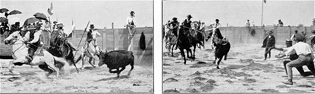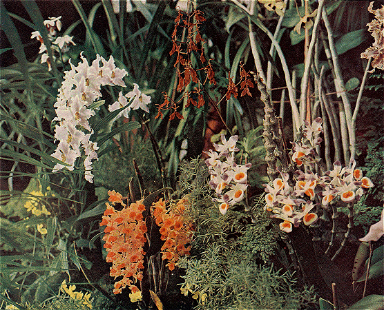 Des potées de bégonias «Gloire de Lorraine» appelaient d'emblée les regards des profanes par le prestige de leur ton de rose brique, et les connaisseurs les proclamaient presque uniques parmi les bégonias hybrides, supérieurs au prototype naturel et homogène. Hybride encore, ce groupe de cinéraires où le bleu indigo lutte avec le rouge sang et le violet intense pour composer un tableau qui met l'oeil en tumulte, et l'on sent bien que l'audace imaginative et la persévérance du botaniste ont passé par là et surenchéri victorieusement sur la conception de la nature... Quant à la tribu des orchidées qui emplissaient huit salonnets de leurs gestes pleins de fier décorum ou de grâce aristocratiquement alanguie et retombante, il faudrait des pages pour les énumérer et les dépeindre. Jamais on n'avait vu réunie une telle profusion de ces Reines exquises et «maniérées» du monde végétal,--à croire que cette élite patricienne était devenue une démocratie innombrable. Que dire de l'infinité et de la subtilité de leurs bigarrures, et comment définir des nuances qui vont de la teinte de la neige ou du nuage à celles des velours violets, des satins verts ou des bronzes dorés. Le groupe que montrent nos photographies et où elles se présentent, au milieu des hautes et souples lianes dont elles sont les luxueuses parasites, appartient à un assortiment magnifique des genres odontoglossum, cattleyas, amarylles et vandas qui se déroulent en grappes jaunes, blanches ou mauves, en silhouettes d'insectes ou d'oiseaux, ou en admirables cols d'urnes.