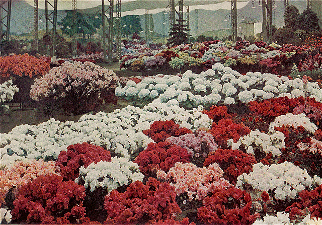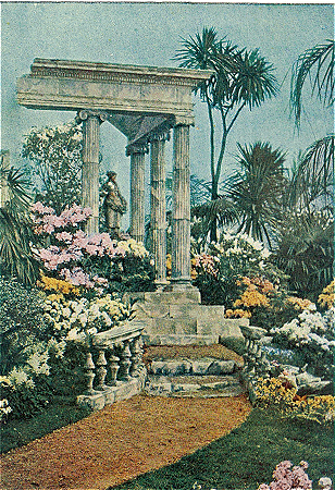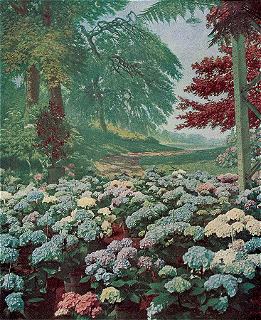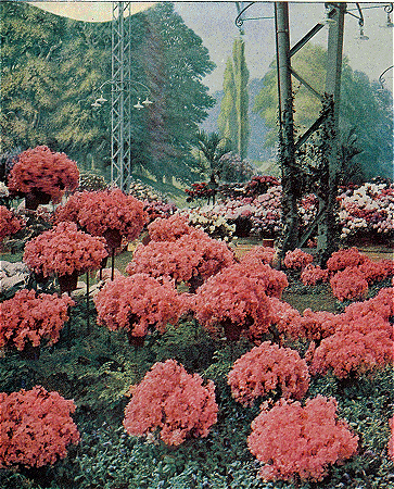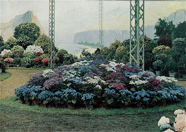 Les photographies en couleurs, que nous reproduisons, du récent «concours de beautés» de Gand donneront une idée synthétique de cette périodique et poétique solennité. On y verra que la furie multicolore et odorante des fleurs est elle-même «habillée» d'un joli décor constitué par des dioramas qui situent illusoirement leur splendeur dans un cadre adéquat: ici, à l'orée d'un taillis, le feuillage d'un hêtre rouge tranchant sur les teintes azurées d'un massif d'hortensias; là, les ondulations d'une simili-chaîne de montagnes élargissant l'horizon de pyramides d'azalées; là encore, les ruines, en staff patiné, d'un antique temple grec, dédié à Flore, éternelle divinité de l'éphémère royaume du printemps. A défaut des délicieuses variétés d'oeillets anglais, arrivés en retard, par la suite de la grève générale belge, on a pu fixer les ombelles couleur bleu de ciel d'un groupe d'hortensias dont les experts ont chanté spécialement les louanges, à raison de leur nuance idéale et aussi parce que leurs «éleveurs» avaient su les préserver d'une maladie qui, après quelque temps, les décolore ou les amaigrit. Une variété d'hortensias d'un blanc immaculé apparaît sur une autre de nos gravures et aussi un massif de ces azalées à fleur simple ou double, unicolores ou panachées, qui constituent la spécialité gantoise par excellence et qui étonnent, aux Floralies, par leur opulente profusion et la recherche de leur coloris.