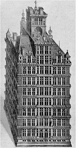 C'est bien un «gratte-ciel», avec ses multiples étages, son architecture massive et régulière, où se reconnaissent pourtant, aux détails d'ornementation, la grâce et la mesure du goût français, que figure l'ancienne estampe reproduite ici, dont nous devons la communication à un de nos lecteurs, M. Félix Rochet, de Pigeac.
