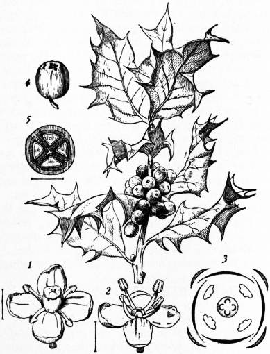 The common holly, or Hulver (apparently the κήλαστρος of Theophrastus;1 Ang.-Sax. holen or holegn; Mid. Eng. holyn or holin, whence holm and holmtree;2 Welsh, celyn; Ger. Stechpalme, Hulse, Hulst; O. Fr. houx; and Fr. houlx),3 I. Aquifolium, is an evergreen shrub or low tree, having smooth, ash-coloured bark, and wavy, pointed, smooth and glossy leaves, 2 to 3 in. long, with a spinous margin, raised and cartilaginous below, or, as commonly on the upper branches of the older trees, entire—a 615 peculiarity alluded to by Southey in his poem The Holly Tree. The flowers, which appear in May, are ordinarily dioecious, as in all the best of the cultivated varieties in nurseries (Gard. Chron., 1877, i. 149). Darwin (Diff. Forms of Flow., 1877, p. 297) says of the holly: “During several years I have examined many plants, but have never found one that was really hermaphrodite.” Shirley Hibberd, however (Gard. Chron., 1877, ii. 777), mentions the occurrence of “flowers bearing globose anthers well furnished with pollen, and also perfect ovaries.” In his opinion, I. Aquifolium changes its sex from male to female with age. In the female flowers the stamens are destitute of pollen, though but slightly or not at all shorter than in the male flowers; the latter are more numerous than the female, and have a smaller ovary and a larger corolla, to which the filaments adhere for a greater length. The corolla in male plants falls off entire, whereas in fruit-bearers it is broken into separate segments by the swelling of the young ovary. The holly occurs in Britain, north-east Scotland excepted, and in western and southern Europe, from as high as 62° N. lat. in Norway to Turkey and the Caucasus and in western Asia. It is found generally in forest glades or in hedges, and does not flourish under the shade of other trees. In England it is usually small, probably on account of its destruction for timber, but it may attain to 60 or 70 ft. in height, and Loudon mentions one tree at Claremont, in Surrey, of 80 ft. Some of the trees on Bleak Hill, Shropshire, are asserted to be 14 ft. in girth at some distance from the ground (N. and Q., 5th ser., xii. 508). The holly is abundant in France, especially in Brittany. It will grow in almost any soil not absolutely wet, but flourishes best in rather dry than moist sandy loam. Beckmann (Hist. of Invent., 1846, i. 193) says that the plant which first induced J. di Castro to search for alum in Italy was the holly, which is there still considered to indicate that its habitat is aluminiferous. The holly is propagated by means of the seeds, which do not normally germinate until their second year, by whip-grafting and budding, and by cuttings of the matured summer shoots, which, placed in sandy soil and kept under cover of a hand-glass in sheltered situations, generally strike root in spring. Transplantation should be performed in damp weather in September and October, or, according to some writers, in spring or on mild days in winter, and care should be taken that the roots are not dried by exposure to the air. It is rarely injured by frosts in Britain, where its foliage and bright red berries in winter render it a valuable ornamental tree. The yield of berries has been noticed to be less when a warm spring, following on a wet winter season, has promoted excess of growth. There are numerous varieties of the holly. Some trees have yellow, and others white or even black fruit. In the fruitless variety laurifolia, “the most floriferous of all hollies” (Hibberd), the flowers are highly fragrant; the form known as femina is, on the other hand, remarkable for the number of its berries. The leaves in the unarmed varieties aureo-marginata and albo-marginata are of great beauty, and in ferox they are studded with sharp prickles. The holly is of importance as a hedge-plant, and is patient of clipping, which is best performed by the knife. Evelyn’s holly hedge at Say’s Court, Deptford, was 400 ft. long, 9 ft. high and 5 ft. in breadth. To form fences, for which Evelyn recommends the employment of seedlings from woods, the plants should be 9 to 12 in. in height, with plenty of small fibrous roots, and require to be set 1 to 1½ ft. apart, in well-manured and weeded ground and thoroughly watered.