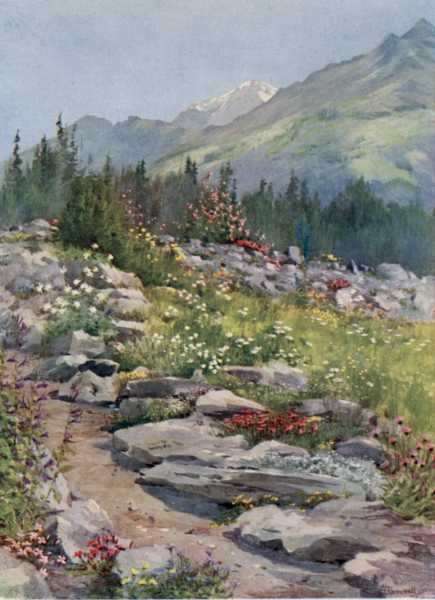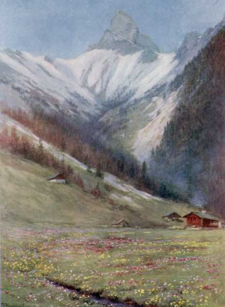 The Swiss Alps have their chief worshippers in the summer for the climbing, in the winter for the sports. A few insist that the rich colouring of autumn is the best season of all. A larger and a growing number visit the Alps in the spring for the flowers. They are wise, for truly the sight of an Alpine meadow in bloom is the most joyous manifestation of Nature in a sunny mood that man can know. Whether it be that the flowers, fertilised by the detritus which the winter's snow has brought to their roots, are really more luxuriant and brighter in colour than the same flowers in a garden or a woodland dell of the plains; or that the clear air and the contrast with the white snow around make them seem more brilliant—Alpine flowers shine out with an exquisite and star-like grace that can154 be noted nowhere else; and the green of Alpine grass seems of a clear brightness that no other herbage can rival.