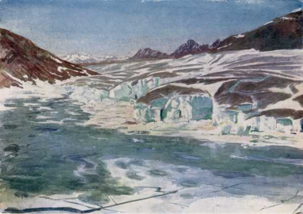 The nearness to the snow has certainly an effect in enhancing the charm of these Alpine meadows. The flowers, wearing the colours of the sun, rush bravely to the very edge of the snow-fields as though they were jostling the winter aside. The white has barely disappeared before there is green and gold and red to give cheerful greeting to the spring sky, and declare another foot of territory won from the frost. Indeed, if you will look closely at the line of the retreating snow—not a straight line but a billowy one, here receding into a big bay, here stubbornly holding out a promontory of white—you will note that the crevellated edge of the vanishing snow mass is not joined to the earth at all, but forms a little overhanging cliff of ice. The melting warmth is coming up from the ground rather than from the sun in the last stage of the snow-field's flight, and underneath this tiny cliff the vegetation can be seen already pushing up to life.