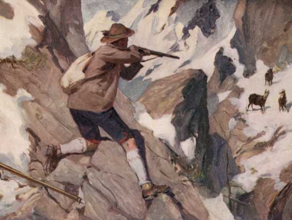 Now follows a marvellous scene—that of a band of chamois in full retreat. The speed and agility of their flight is wonderful. They are faced by a precipice. They skim up it one after the other like swallows. There is no path, no ridge, no ledge: but here and there little knobs of rock jut out from the face of the cliff, and they spring from projection to projection with incredible sureness and skill, their four feet sometimes bunched together on a patch of rock not much larger than a man's fist. They vanish with lightning rapidity, and the hunter must turn away in search of another band, for these will not halt till they are far beyond his reach in some sanctuary of the hills quite inaccessible to him.